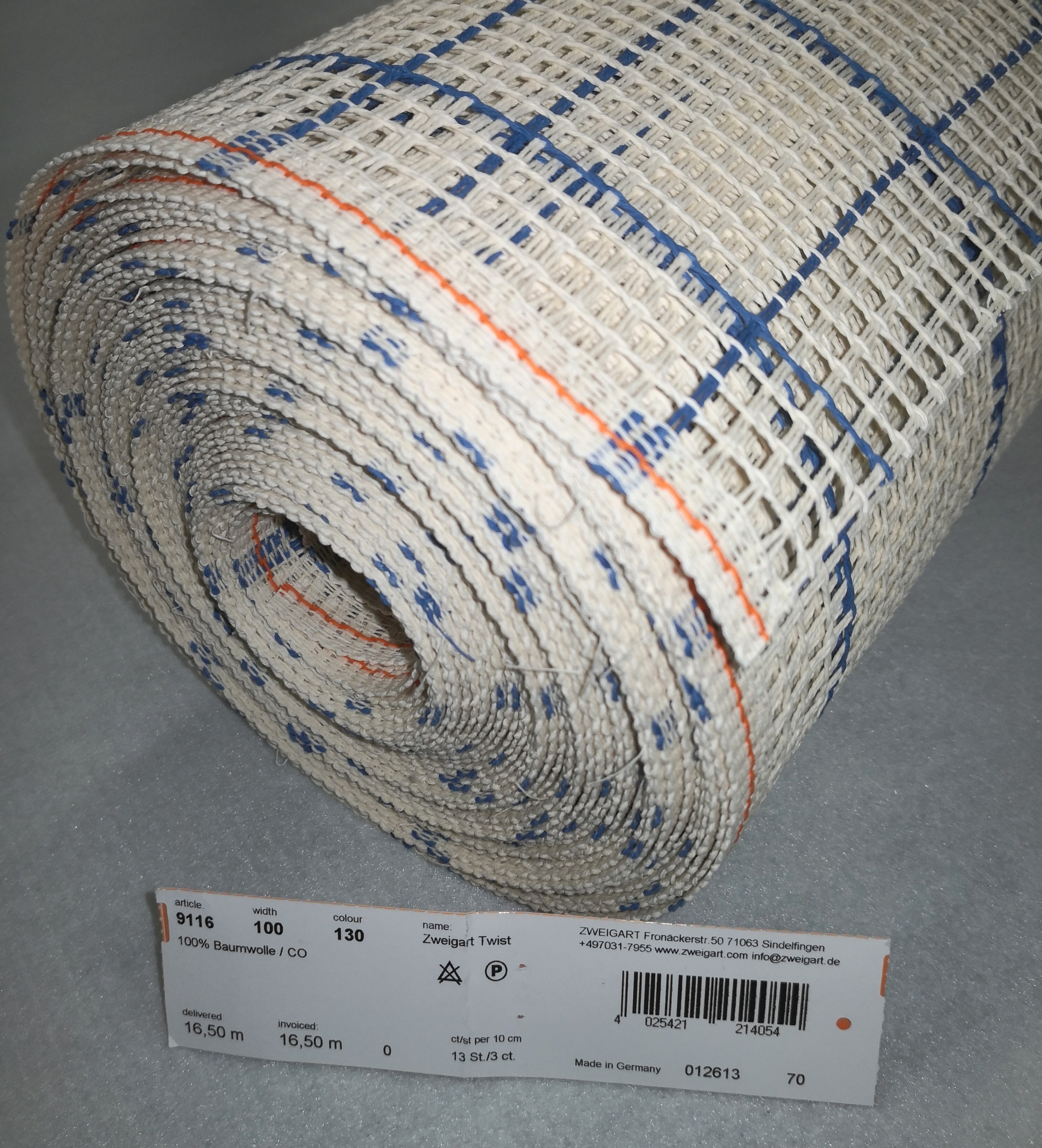 Aito Zweigartin Twist 9116 käsityökangas, jonka leveys on noin 1 metri. Ruutukoko on noin 6mm ja ruutuja 13 / 10cm. Materiaalina 100% puuvilla. Väri on vaalea beige. Mitoituksen helpottamiseksi on kankaaseen painettu sinisellä värillä ruudutus, jonka sisään mahtuu 10 pikkuruutua kumpaankin suuntaan. Tästä laadukkaasta pohjasta askartelet vaikkapa upeita mattoja ja valoryijyjä tai vallan jotain muuta.