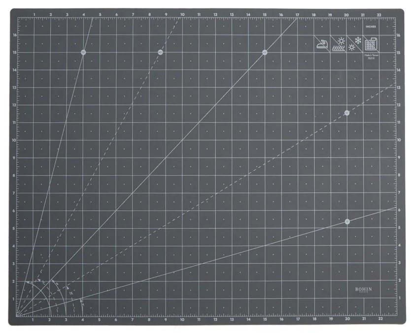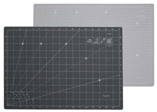 Bohinin itsekorjautuva leikkausalusta tilkkutöihin ym. leikkaamiseen. Alustan toisella puolella cm-mitoitus ja toisella puolella tuuma-mitoitus. 2mm:n paksuus antaa vakaan leikkuutuntuman sekä edistää alustan kestävyyttä. Alustassa selkeä ruutukuvio. Alustasta löytyy alueet, joissa tuumaruudutus on jaettu kahdeksasosatuumiin ja cm-ruudutus puoliin centteihin. Myös mm-asteikko löytyy cm-puolen reunoilta. Vastaavat tuuma-merkinnät toisella puolen alustaa. Kun alustaan syntyy leikkuu-ura, pyrkii uran reuna painumaan takaisin toista reunaa vasten. Alustan väri vaalea harmaa/valkoiset merkinnät (cm-puoli) ja tumma harmaa/valkoiset merkinnät (tuuma-puoli). Kätevät kulmamerkinnät 15 astetta, 30 astetta, 45 astetta, 60 astetta ja 75 astetta. Kolmikerrosrakenne. Leikkauskerrosten välissä suojakerros.
