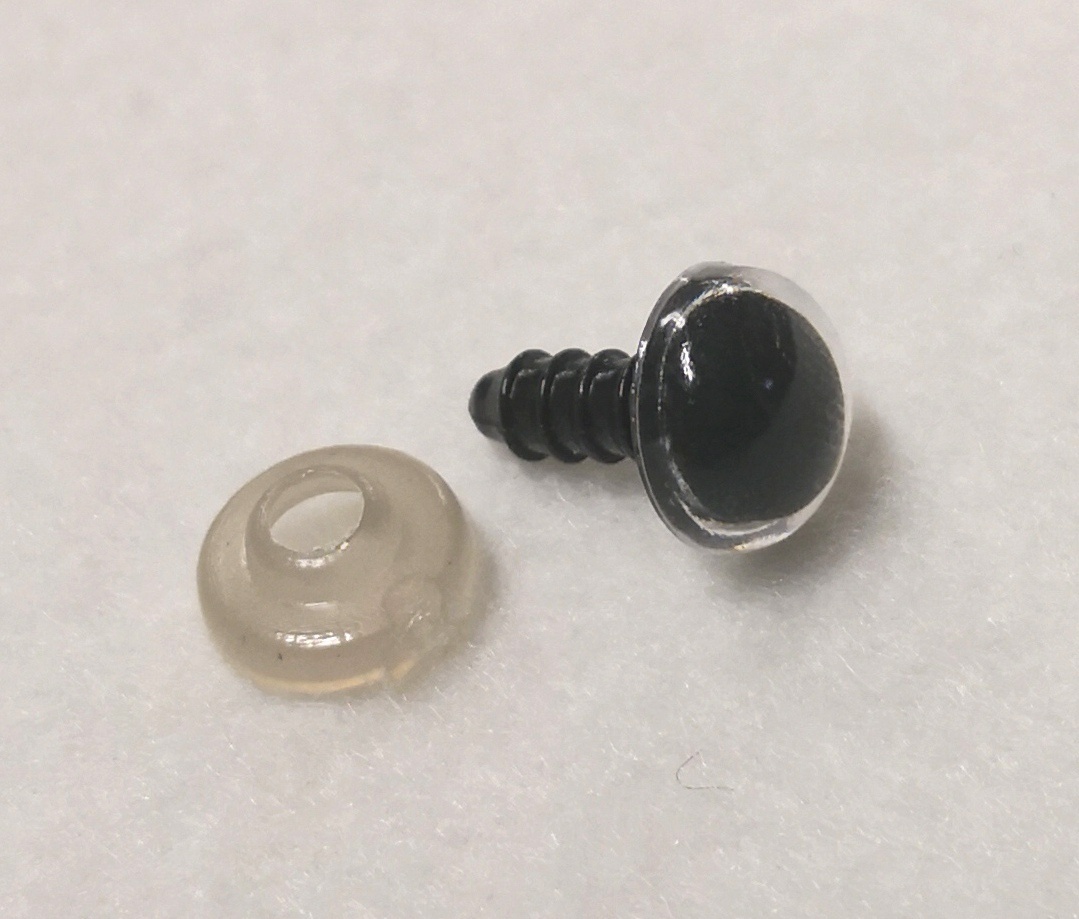 Kirkas turvasilmä mustalla keskustalla. Silmän läpimitta on noin 12mm ja kokonaispituus noin 17mm. Lukittuu painettavalla muovirenkaalla. Pakkauksessa 20 silmää eli 10 silmäparia.